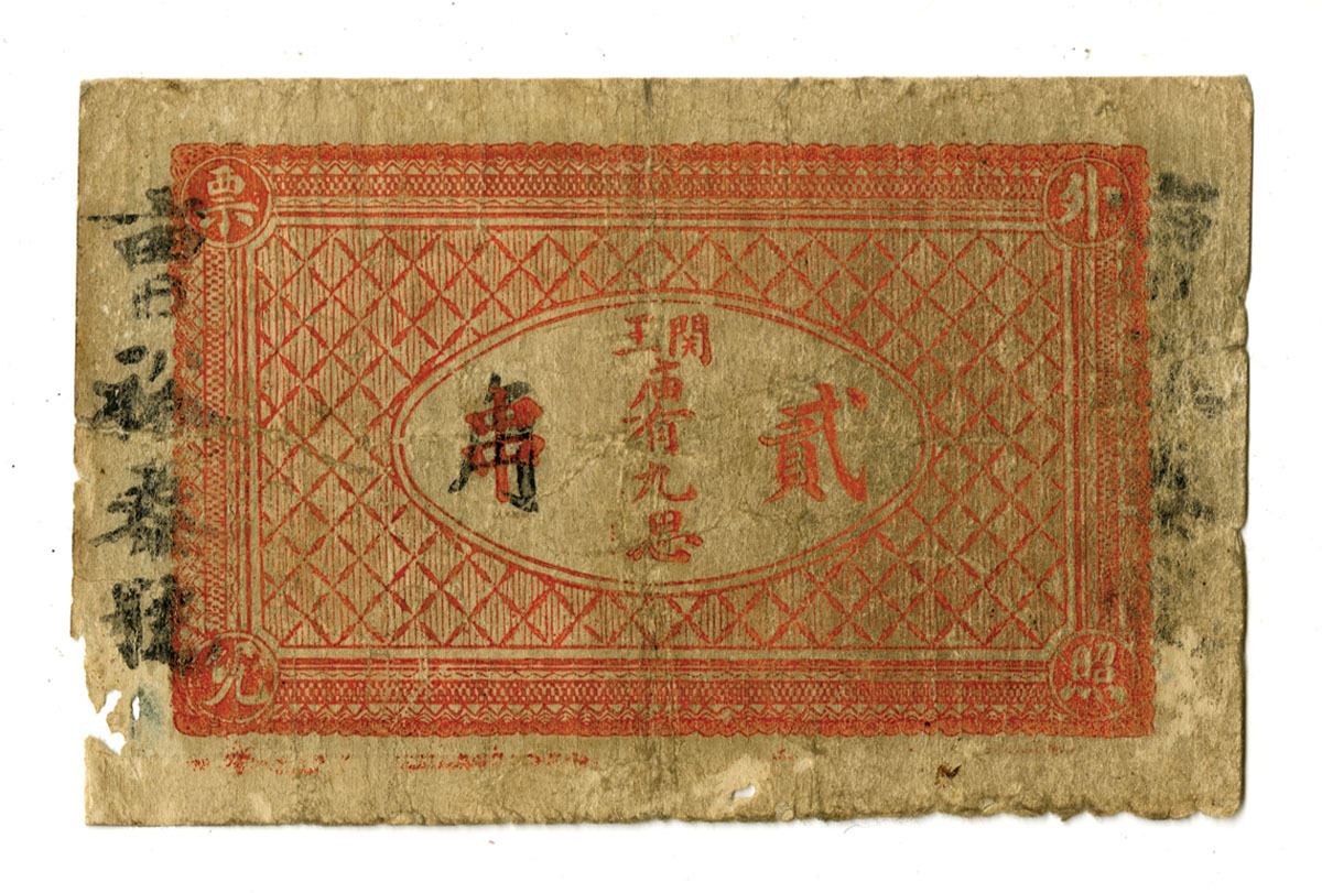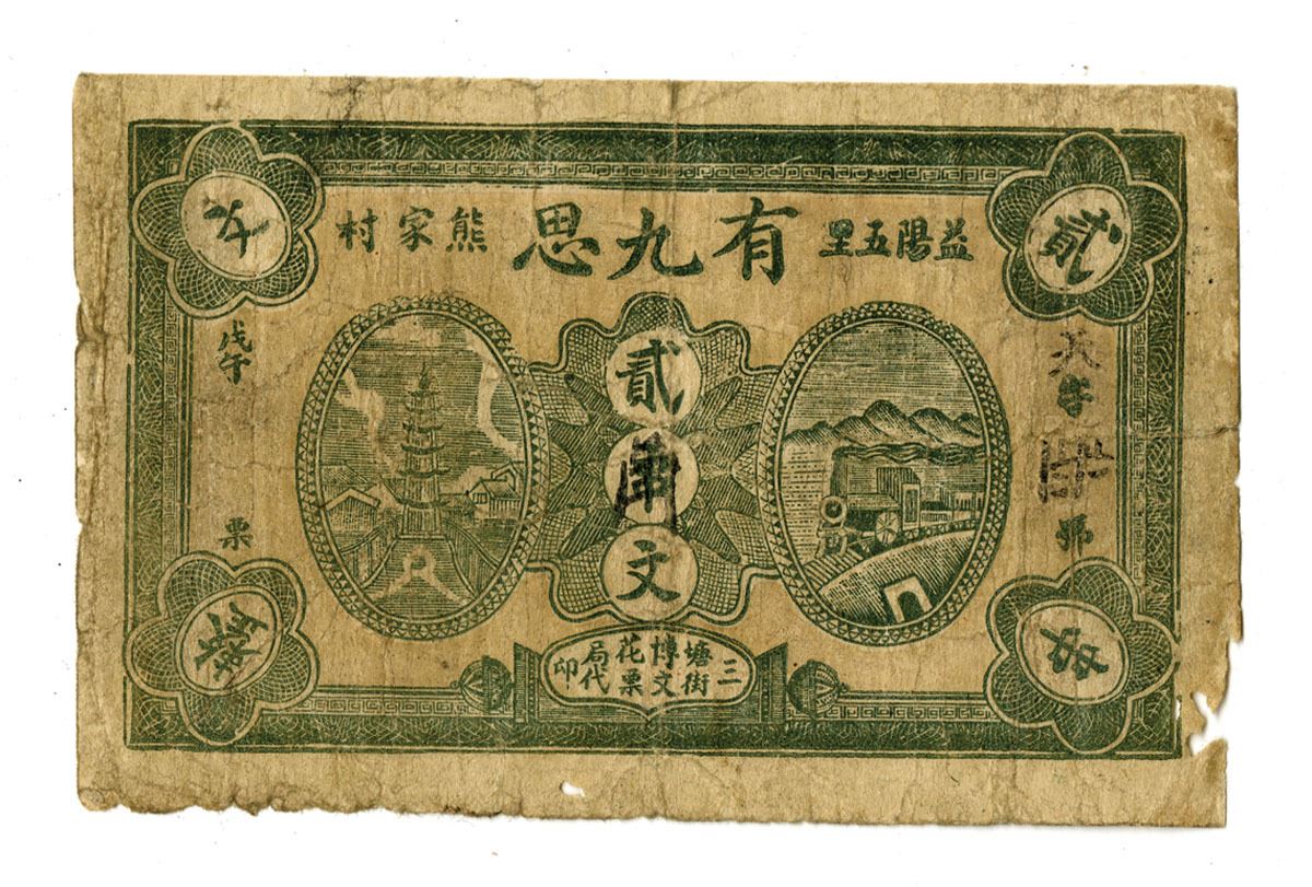 China, ca. 1920–1930s; 2 wen local merchant note issued by You Jiu Si, referencing Xiongjia Village. Pagoda and locomotive vignettes on front, red reverse with 'Wu' seal. Condition: Good to VG.