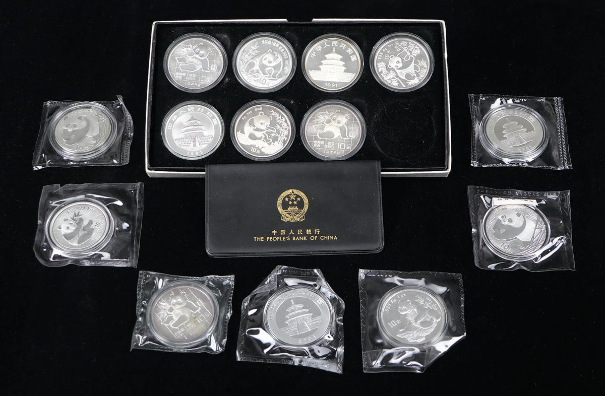 group of 14 Silver Proof and Uncirculated SIlver Pandas; uncirculated dates are 1989 (3), 1990, 1991, 1992, 1993, 1994, and 1998; proofs include 2000, 2001 (2), 2002, and 2004 (14 ounces of silver). Shipping charges apply - weight 1.6 lbs. (photo on web site)