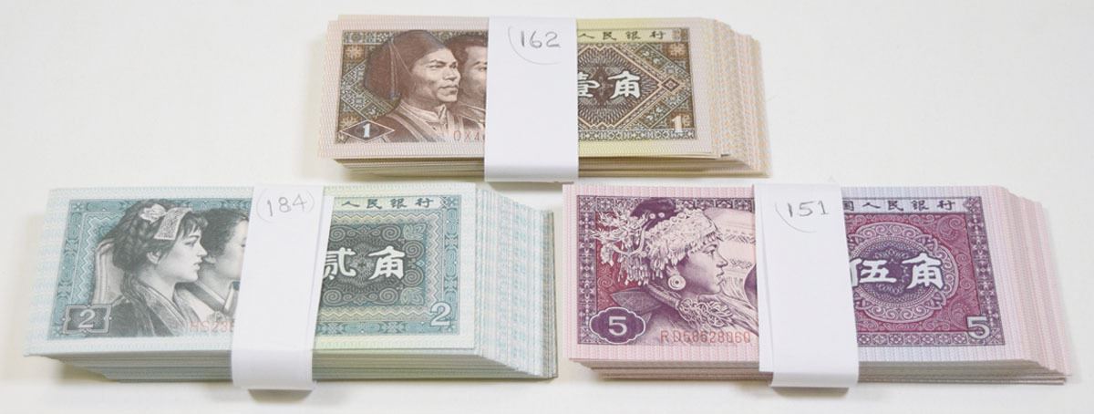China, 1980…...., Lot of 450+ Issued Banknotes, Includes: 1 Jiao, P-881 (162); 2 Jiao, P-882 (184); 5 Jiao, P-883 (151). Notes are in AU to Gem UNC condition. (450+). Sold "AS IS" no returns accepted.