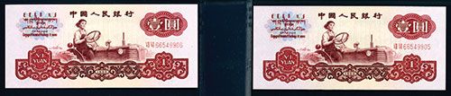 Lot of 2 banknotes, China, 1960, 1 Yuan, P-874c (S/M#C284- ), Issued sequential banknote pair, Watermark 5 Star Pattern, Block 76, Prefix 2 Roman Numerals, S/N VII VI 66549905 and 66549906, both PMG graded Gem Uncirculated 66 EPQ, rare high grade pair.