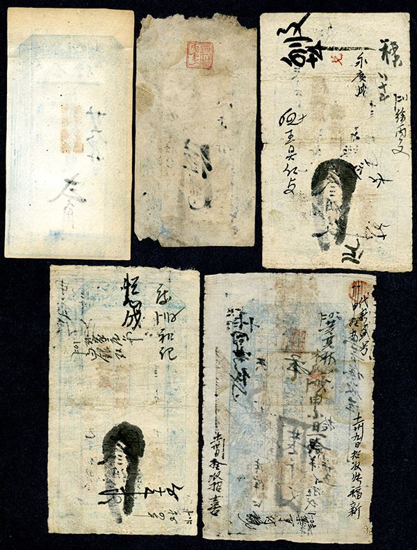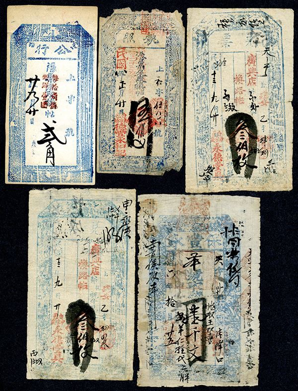 China. Includes: Kuang Shing Shop, 1924; Yung Be Tung Exchange note, 300 Coppers; Po Fung Wing, Tongzi year 6. plus two others. All with blue print, and hand ink notations. Generally Very Fine to Extremely Fine. 5 pieces.