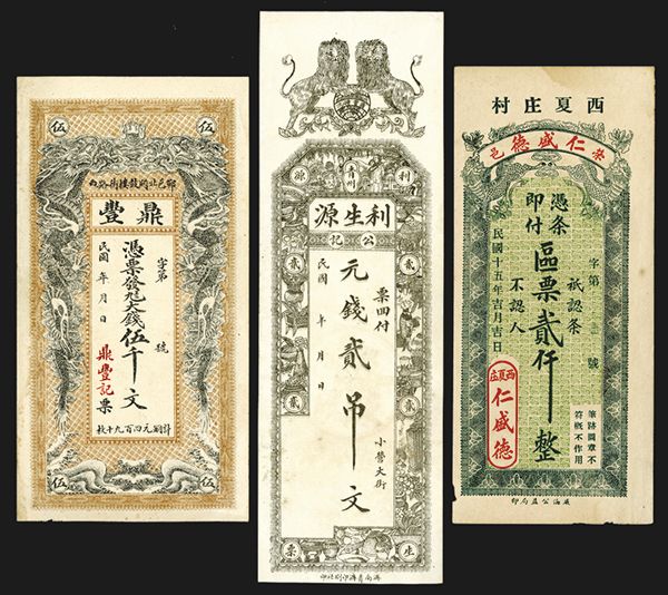China, Lot of 3 notes, All are ND ca.1920-30's issues. Includes Hsi Hsia Chuang Tsun - Jen Sheng Te Bank, 2000 Wen, Blue with red text, back violet with flowers in pot, AU; Shantung, Lee Shen Yung, 2 Tiao, dark brown with facing lions, back yellow, XF-AU; China, Facing Dragons, Private Bank, 5000 Wen, AU-Unc., black on brown border, back dark blue-green with tree, lake and building scenes, AU. Scarce private bank issues.