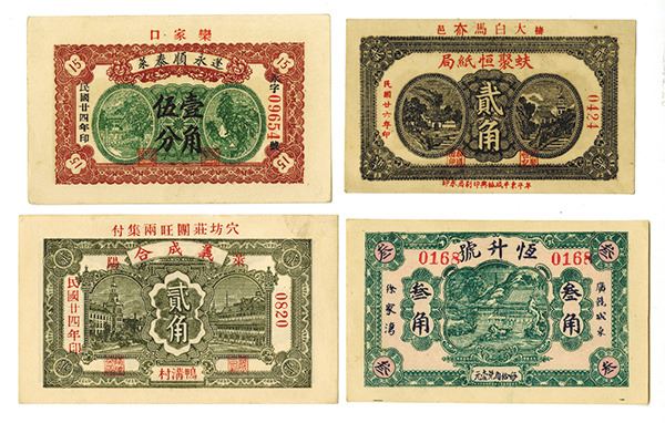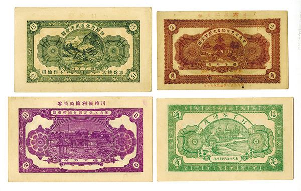 China. Lot of 4 notes, all are smaller horizontal format notes with various designs, denominations and dates, Includes Local and Private issues, all with temples, buildings and other structures, Condition varies between AU to CU condition, All are issued. Attractive assortment that deserves further study. All are written in Chinese with no English text. (4)