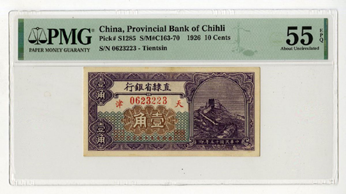 Tientsin, China, Provincial Bank of Chihli, 1926 Issue, 10 cents, P-S1285 S/M#C163-70, Issued banknote, Violet on Brown on m/c underprint, Great Wall at right, S/N 0623223, PMG graded About Uncirculated 55 EPQ.