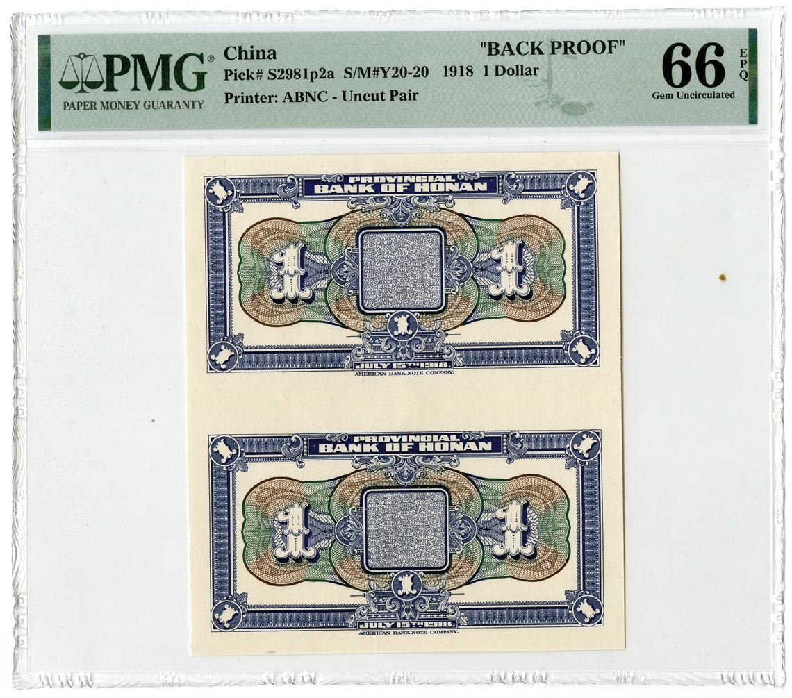 China, 1918. 1 Dollar, P-S2981p2a S/M#Y20-20, Uncut Pair of Back Proofs, Blue on m/c underprint with bank title at top, Uniface notes, PMG graded Gem Uncirculated 66 EPQ, ABNC.