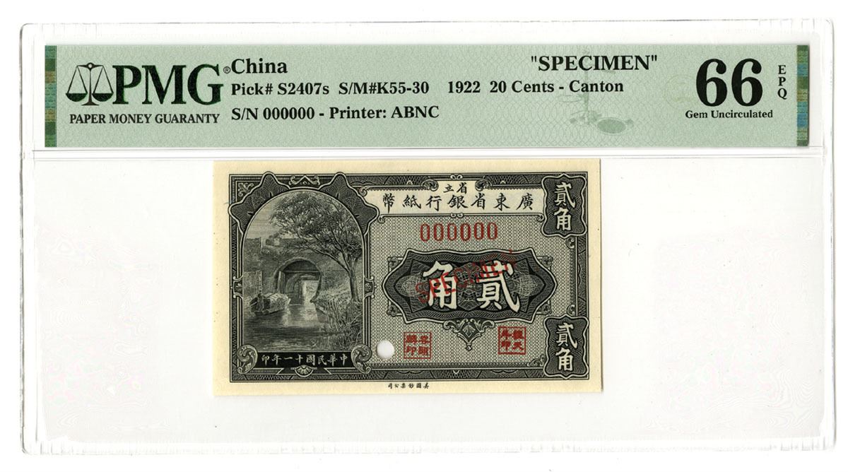 Canton, China, 1922. 20 Cents, P-S2407s S/M#K55-30, Specimen Banknote, Black and white print with river and tunnel at left, Back is blue and m/c, Specimen overprints and POCs, PMG graded Gem Uncirculated 66 EPQ, ABNC.