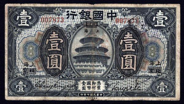 China. 1918. $1. P-51l (S/M #C294-100k). Issued banknote, Blue-black on m/c with "Temple of Heaven" in middle, back is Blue-black. S/N 007873. Choice VG to almost fine with great paper quality, minimal margin issues and 2 very small pin holes in middle of note, otherwise very attractive for grade. Rare and desirable note in any condition. ABNC.