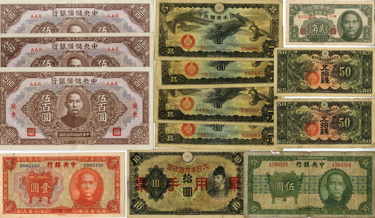 China, 193 to 1949. Lot of 13 Issued Banknotes, Includes: Japanese Military WWII - Imperial Government 50 Sen, P-M14 (2) S/M#T31-4; 5 Yen, P-M17a (4) S/M#T30-11; 10 Yen, P-M27s S/M#T32-4, Specimen Note; Central Bank of China 1 Yuan, P-209, CHB; 5 Yuan, P-222, CHB; 10 Cents, P-433 S/M#C304-6, CHB; Central Reserve Bank of China 500 Yuan, P-J24b (3). Banknotes range from VF to XF-AU condition. (13). Sold "AS IS" no returns accepted.