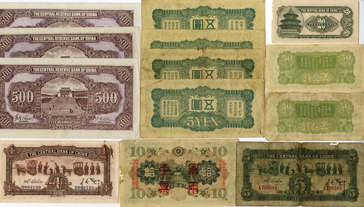 China, 193 to 1949. Lot of 13 Issued Banknotes, Includes: Japanese Military WWII - Imperial Government 50 Sen, P-M14 (2) S/M#T31-4; 5 Yen, P-M17a (4) S/M#T30-11; 10 Yen, P-M27s S/M#T32-4, Specimen Note; Central Bank of China 1 Yuan, P-209, CHB; 5 Yuan, P-222, CHB; 10 Cents, P-433 S/M#C304-6, CHB; Central Reserve Bank of China 500 Yuan, P-J24b (3). Banknotes range from VF to XF-AU condition. (13). Sold "AS IS" no returns accepted.