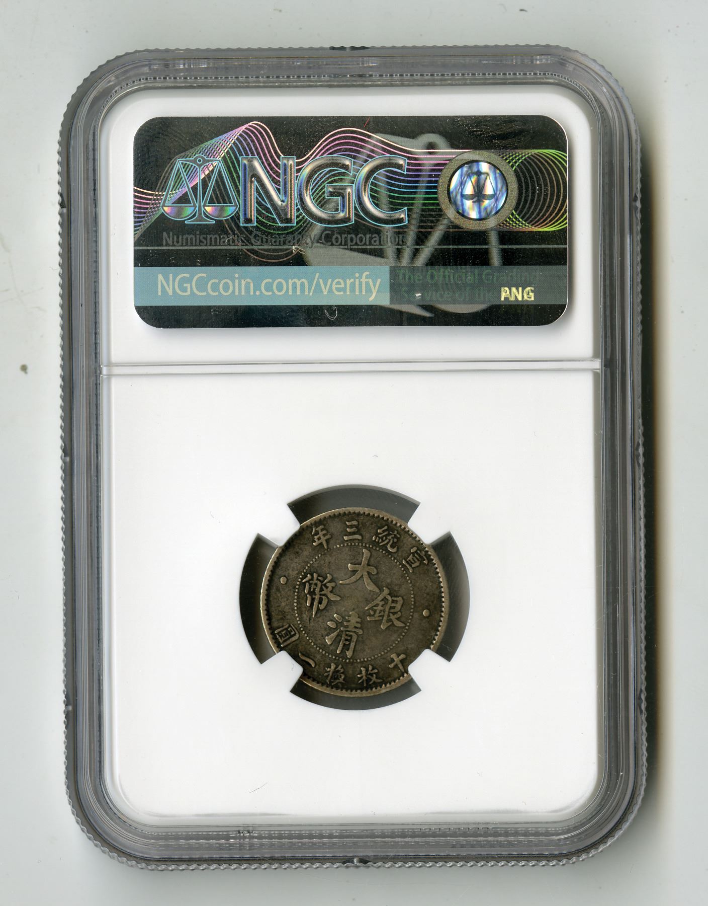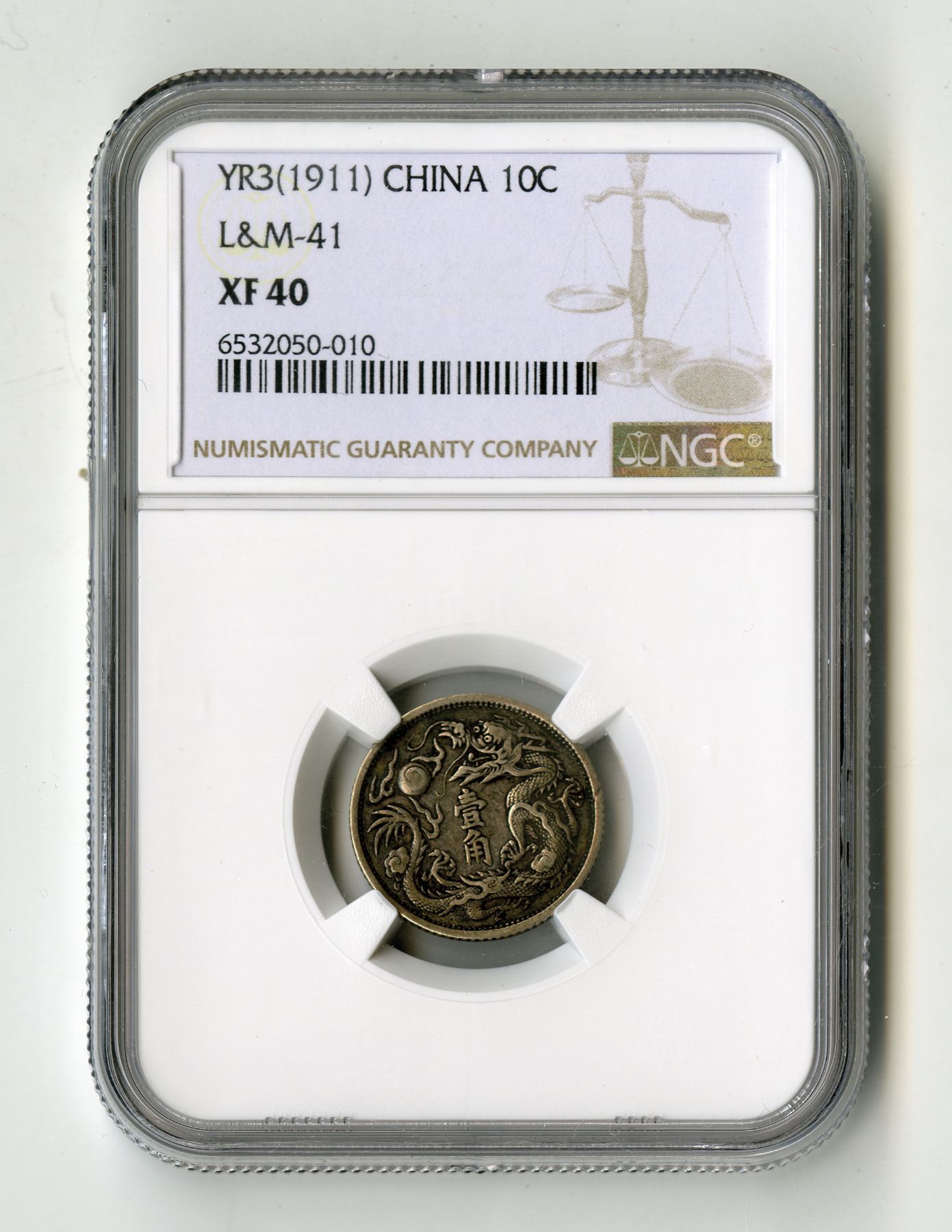 China. Republic of China. 10 Cents, Year 3(1911), L&M-41, NGC XF 40, an attractive example of this desirable coin. Luster is still present on the fields and the coin exhibits minimal wear on the dragon scales.