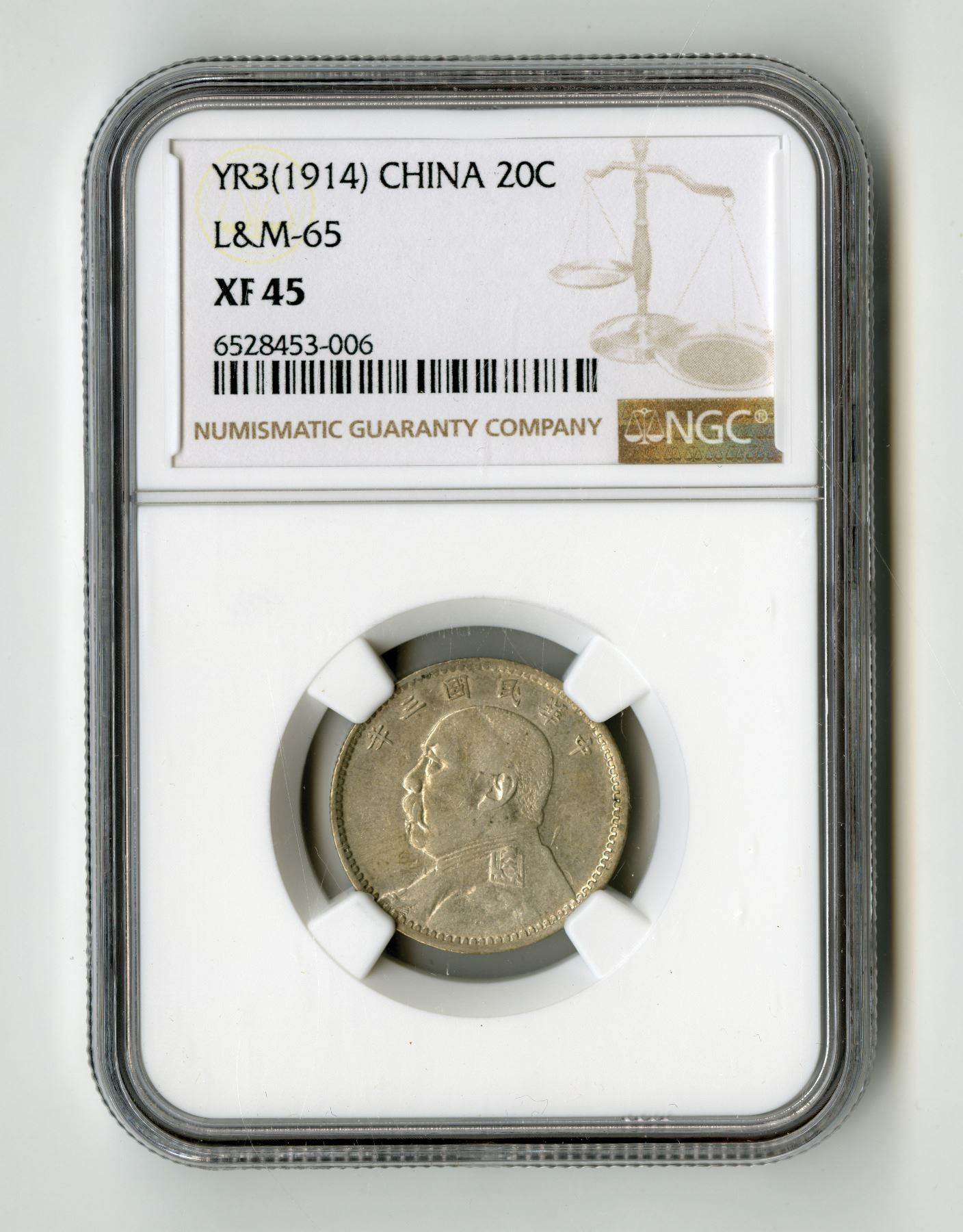 China. Republic of China. 20 Cents, Year 3(1914), L&M-65, NGC XF 45, another desirable "Fat Man" minor with excellent luster and no detrimental marks or wear. The reverse has nice cartwheel luster. _____________