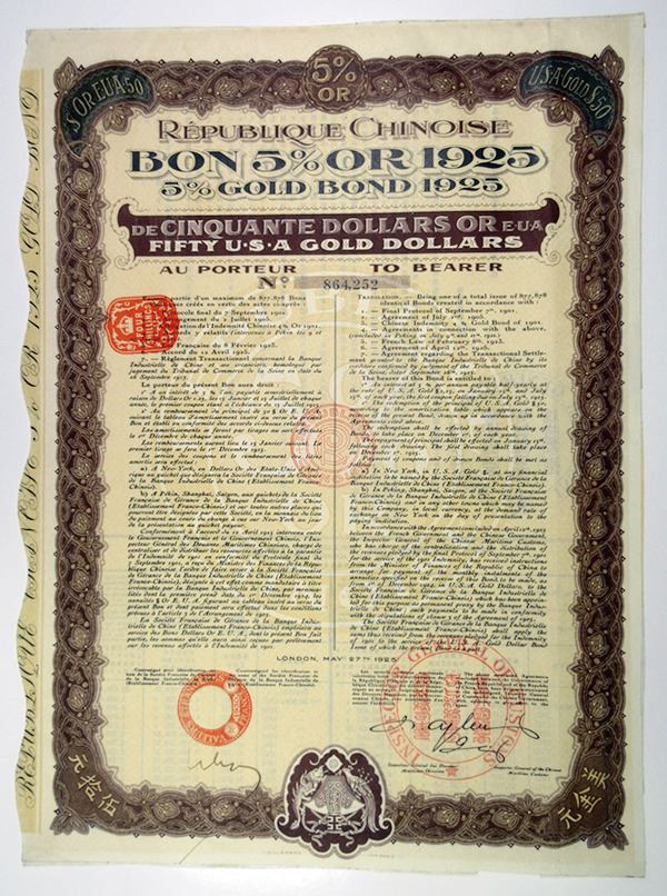 Chinese Republic, 1925. $50 I/U 5% Gold Bond in French and English, Black text with ornate brown border featuring Chinese symbols at bottom corners. VF condition.