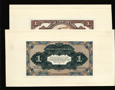 Harbin. China, Russia Russo-Asiatic Bank 1 Ruble proof. 1917. P-S474p. 1 Ruble LD Proof of face and back printed on india paper on large card. Train vignette on face. Choice Unc. Rare as proofs. ABNC.