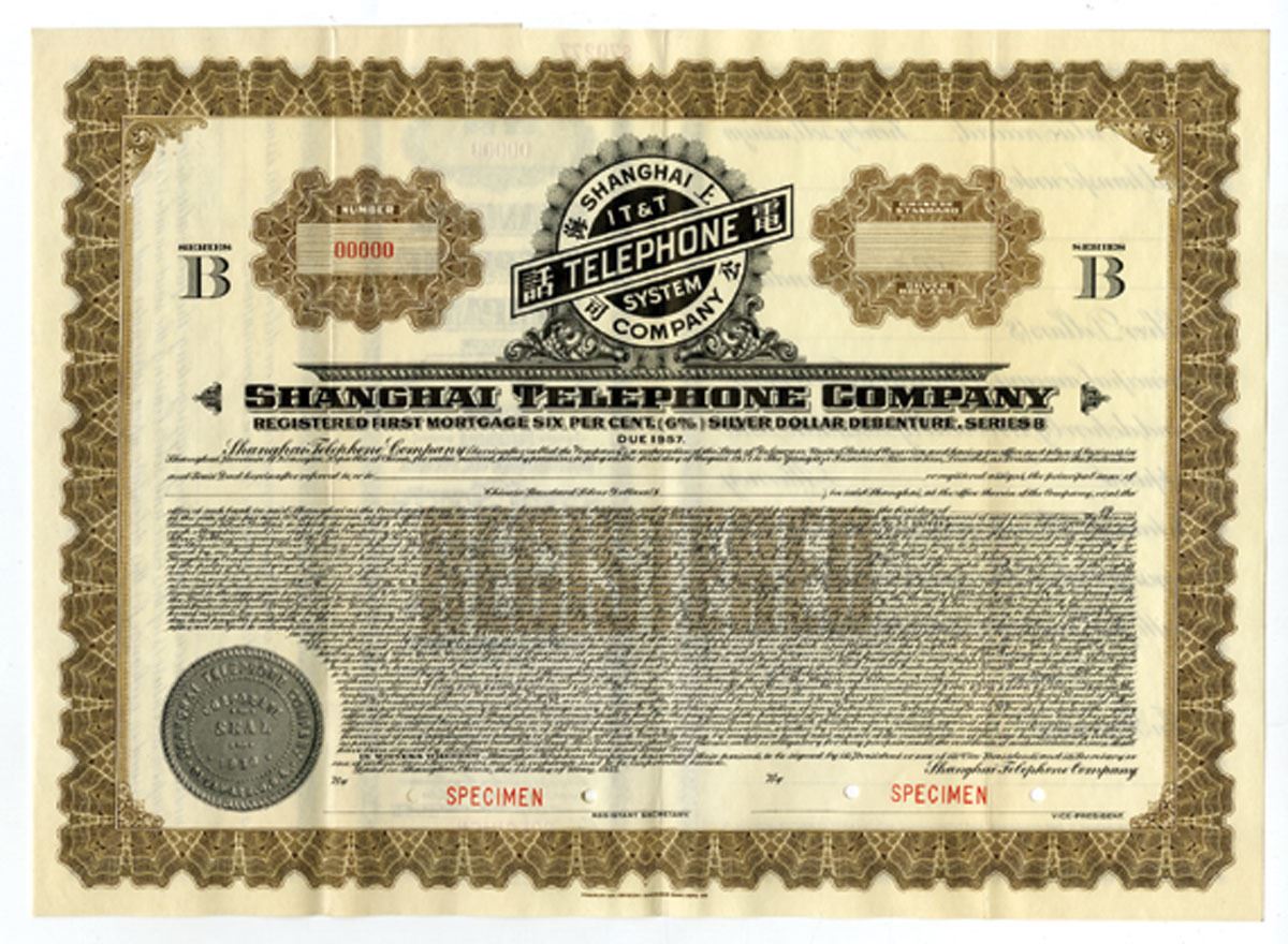 Shanghai, China. 1933. Registered 6% Specimen 1st Mortgage Silver Dollar Debenture, Series B Bond, Brown border with title of company logo of circle in Chinese and English with "IT&T System", Specimen overprints and POCs, "00000" serial numbers, VF to XF condition. Bond is in English. Rare Chinese-American Telephone Company Specimen bond. ABNC.