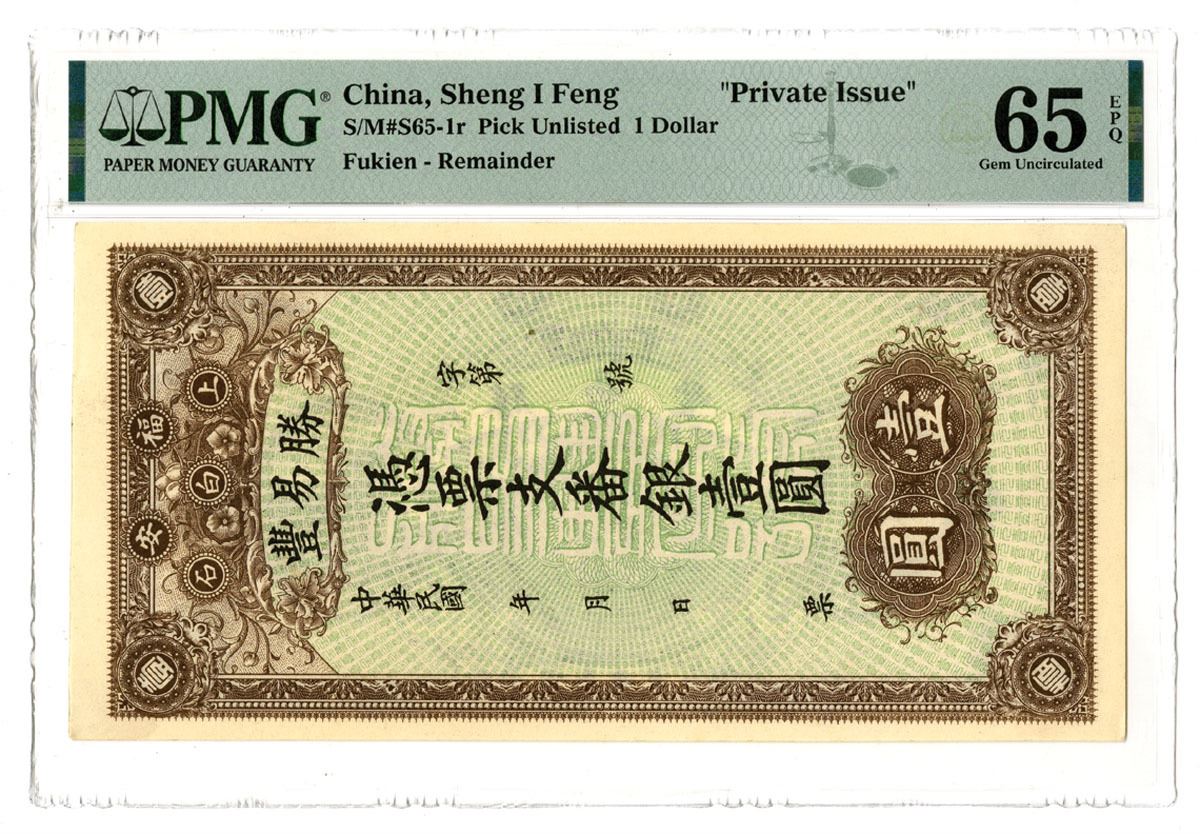 Fukien, China, ND (ca.1900-1916). 1 Dollar, P-Unlisted, S/M#S65-1r, Remainder Banknote, Black with brown on pale green underprint on Vertical style banknote, Back is purple with coin in middle flanked by building and tree scenes in horizontal fashion, PMG graded Gem Uncirculated 65 EPQ.