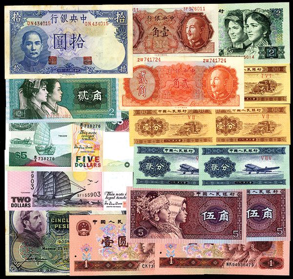 Lot of 17 notes, Includes 14 Chinese banknotes; 2 Singapore Notes and Banco de Espana, 1931 50 Pesetas, P-82 in Choice VF; Other high lights include China, P-245c, AU-Unc; China, 1946, 10 & 20 Cents; China, 5 1953 Second Issues, 1 Fen and 2 Fen; 1980 Issues, up to 1 Yuan; Singapore, 1997 ND, $2 & $5, All but the Spanish note grade Choice to Gem Uncirculated. Attractive banknote assortment.