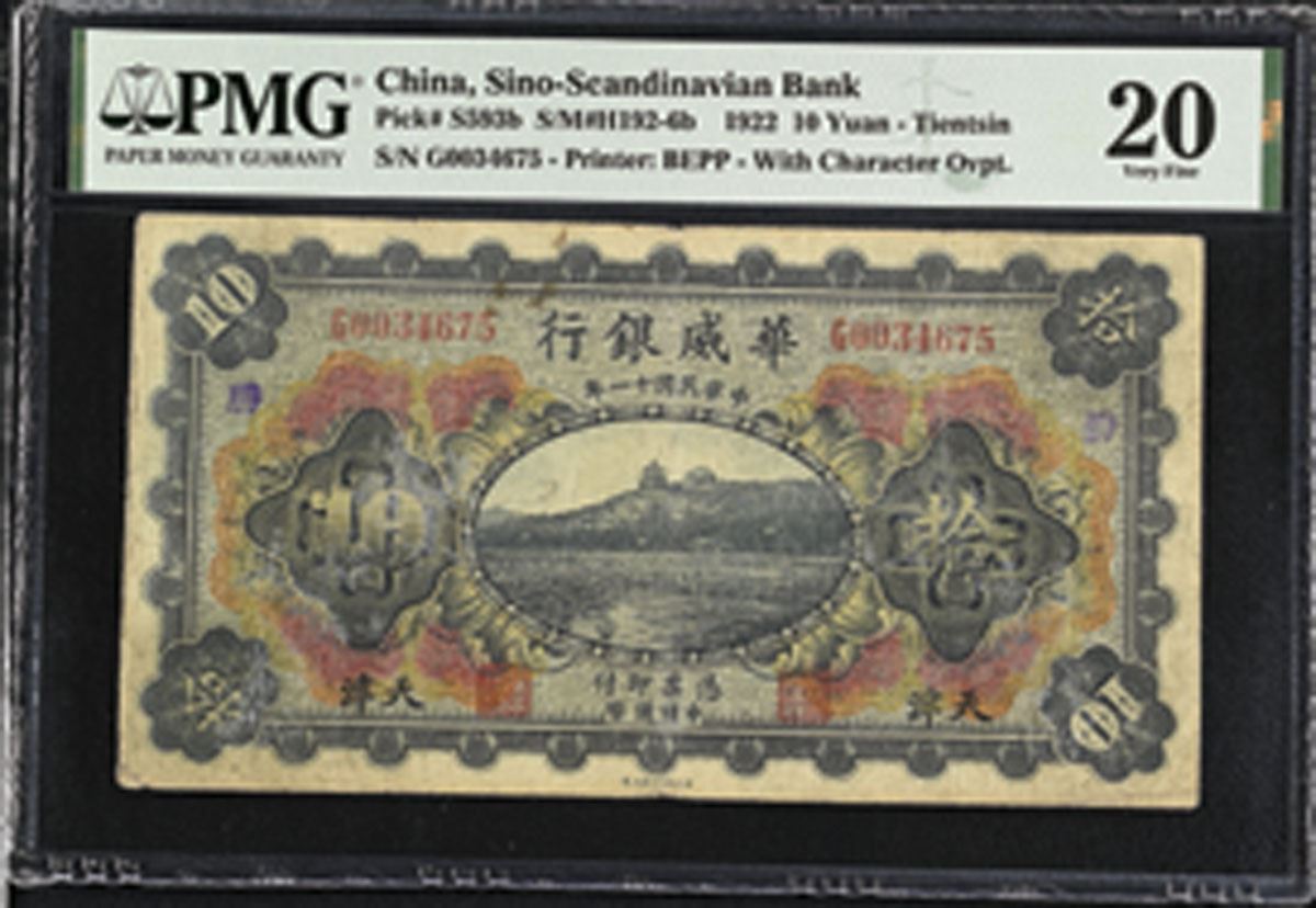 Tientsin, China, 1922. 10 Yuan, P-S593b S/M#H192-6b, Issued banknote, Dark blue on multicolor underprint with temple at center, Back is blue with Long Boat at center with English text, S/N G0034675, PMG graded Very Fine 20, BEPP.
