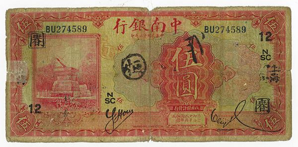 Shanghai, China, 5 Yuan, P-A127b S/M#C295-21a, Issued banknote, red on m/c, monument at left, back blue, multiple handstamps and chop marks on back. Fine to Fine+, ABNC.