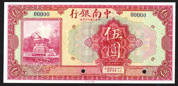 China, 5 Yuan, P-A127s, S/M#C2957-21, S/N 00000, Unlisted Specimen banknote and unlisted without place name, PMG graded Gem Uncirculated 66 EPQ, Red on m/c with monument on left, back blue, Very attractive note. ABNC. Only one note grading higher in the PMG census.