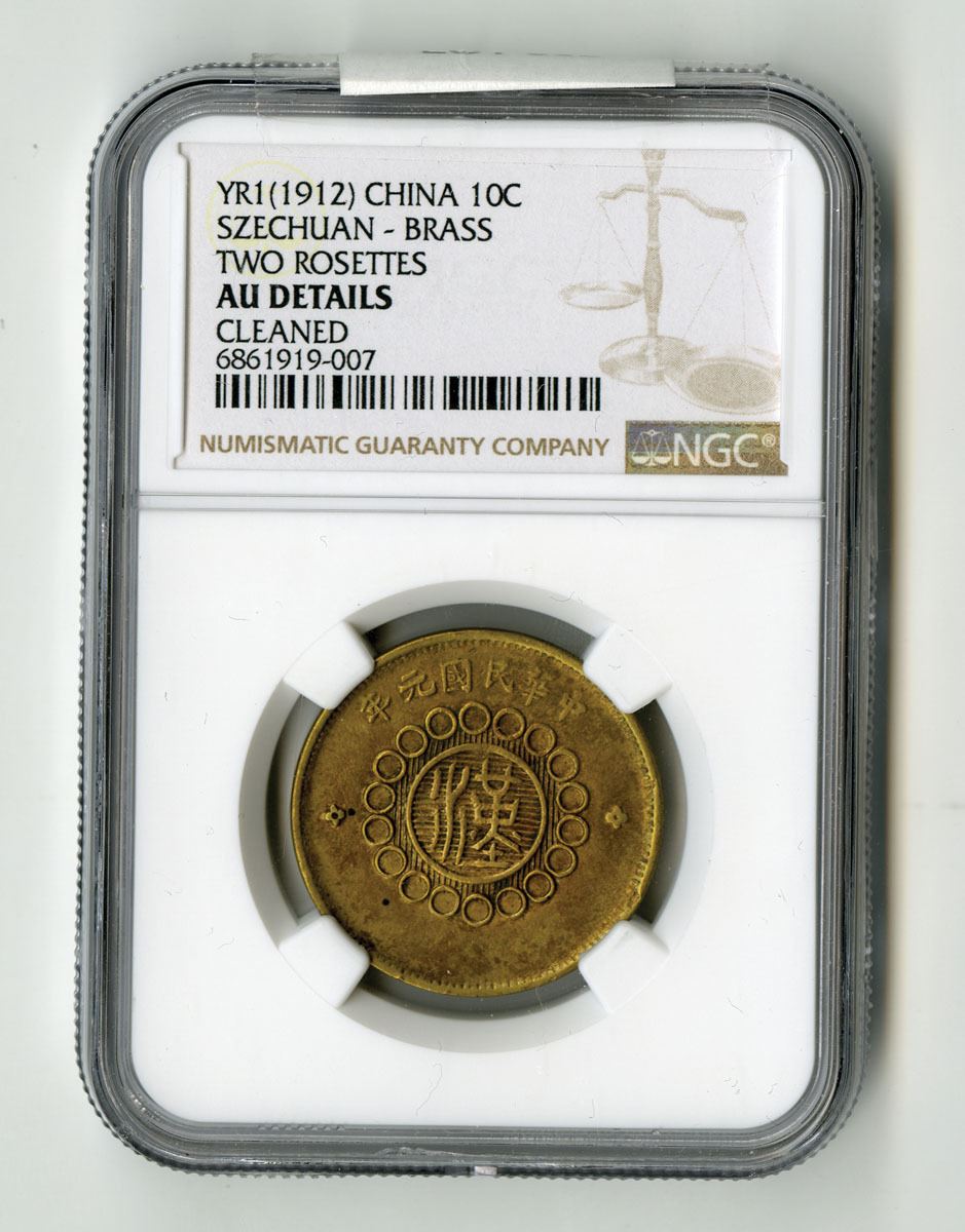 China, Szechuan Province, YR1 (1912), 10 Cash, ‘Two Rosettes’ type, Y#451; brass issue; rev. denomination; NGC AU Details (Cleaned).
