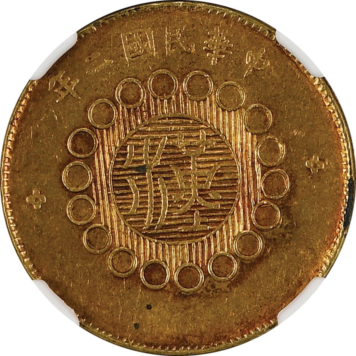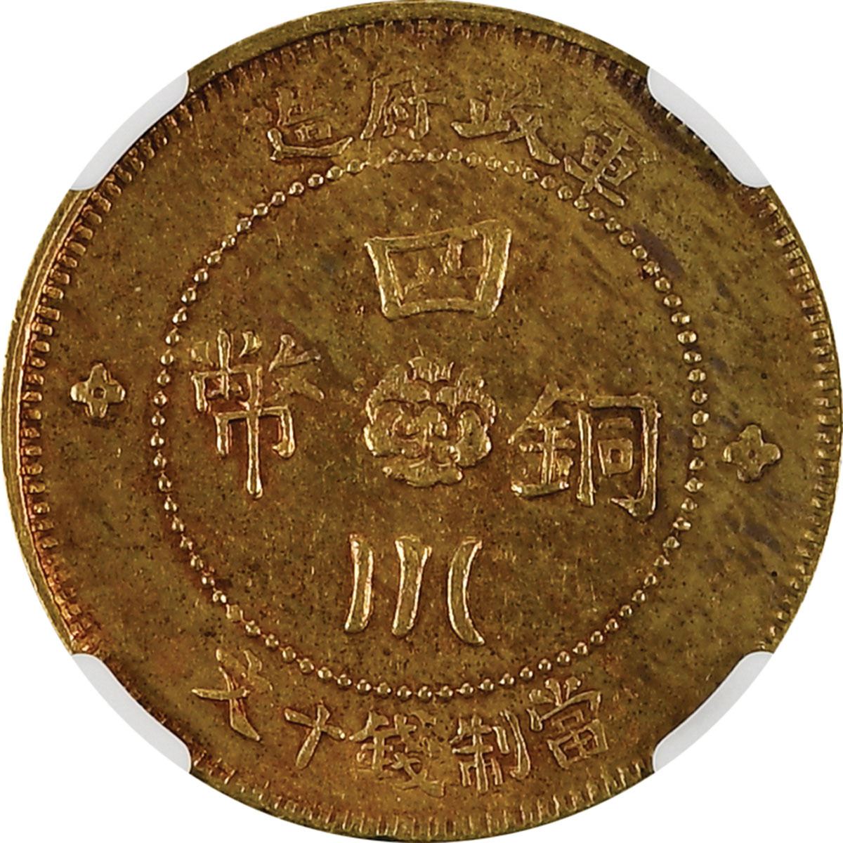 China: Szechuan Province, 10 Cash, Year 2 (1913), Y-447A, Brass, NGC Graded UNC DETAILS - CLEANED. The coin radiates with a warm golden sheen, reminiscent of a harvest sun, while the terracotta undertones add depth to its appearance. Despite the delicate cleaning, there remains a charming softness to its reflectivity, a subtle nod to its erstwhile circulation, gracefully balanced with the sharpness of its engraved characters.