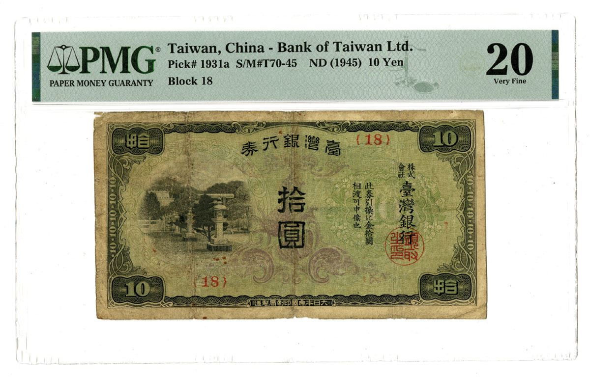 China - Taiwan, ND (1945). 10 Yen, P-1931a S/M#T70-45, Issued Banknote, Black on olive underprint with green at center, Lanterns on road to Tiawan Jinja, Back is dark blue-green without lilac underprint and seascape of a lighthouse point, Block 18, PMG graded Very Fine 20 with comment "Minor Rust."