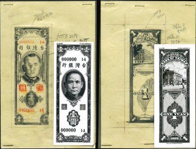 1955. P-Unlisted. 1 Yuan Unique 1 Yuan face and back hand drawn models of an essay banknote that was rejected by the Bank of Taiwan for their 1955 issue. Drawing is on tracing paper with notations of plate or die numbers for portions of note to be engraved. Also included are front and back photo-proof essays of the note that are bank note sized. The front of the note has a portrait of SYS and the back has a drawing of the Island of Taiwan and a building above it. XF condition for this extremely rare group of design and production material relating to the design of Taiwan banknotes. First time offered. SBNC.