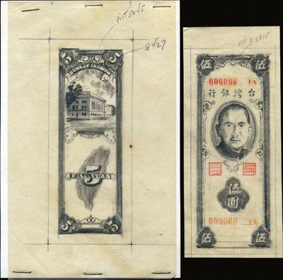 1955. P-unlisted. 5 Yuan Unique 5 Yuan face and back hand drawn models of an essay banknote that was rejected by the Bank of Taiwan for their 1955 issue. Drawing is on tracing paper with notations of plate or die numbers for portions of note to be engraved on the back of the face. Also included is a back photo-proof essay of the note that is bank note sized. The front of the note has a portrait of SYS and the back has a drawing of the Island of Taiwan and a building above it. Condition is XF for this extremely rare group of design and production material relating to the design of Taiwan banknotes. First time offered. SBNC.