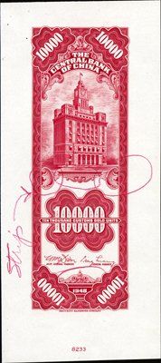 1955. P-unlisted. 5 Yuan 5 Yuan Back. Unique production file with proofs and models used in the design and production of this rejected back design of the Bank of Taiwan 1955, 5 Yuan banknote.This is one of two rejected designs of backs being offered in this sale. Included in this lot are proofs of Chinese banknotes (2); P-Unlisted essay back in red for proposed SBNC, 1945, 5 Yuan bank note with pieces missing from the right and left where they were cut off in the design process and P-363 TC Unlisted, 10,000 Yuan, red, proof. A photo-proof of the banknote back is also included. This version of the bank note has a building on top with the Bank of Taiwan title and a map of Taiwan with the numeral "5" on it and the date at the bottom. Also included are the English Text title for the Bank of Taiwan; denomination and numberal text used or proposed for the notes; the bottom margin text that includes the date; the partially printed proof of the right 2/3rds of a $5 Central Bank of the Philippines essay unlisted note; proofs of the border and design elements used on the note and 1 piece of correspondence relating to the note. XF condition for this extremely rare group of design and production material relating to the design of Taiwan banknotes. First time offered. 12 items included. SBNC.