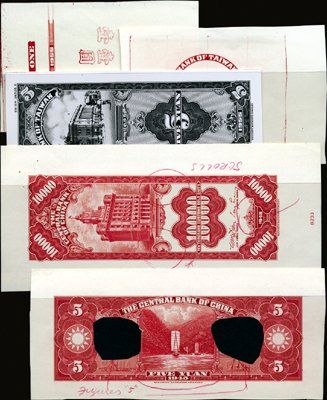 1955. P-unlisted. 5 Yuan 5 Yuan Back (Alternate). Unique production file with proofs and models used in the design and production of this rejected back design of the Bank of Taiwan 1955, 5 Yuan banknote.This is one of two rejected designs of 5 Yuan backs being offered in this sale. Included in this lot are proofs of Chinese banknotes (2); P-Unlisted essay back in red for proposed SBNC, 1945, 5 Yuan bank note with pieces missing from the right and left where they were cut off in the design process and P-363 TC Unlisted, 10,000 Yuan, red, proof with archival notations listing plate and die numbers. A photo-proof of the 5 Yuan banknote back is also included. This version of the bank note has a building on top with the Bank of Taiwan title and a circular ornamental design with the numeral "5" on it and the date at the bottom. Also included are the English Text title for the Bank of Taiwan; denomination and numberal text used or proposed for the notes; the bottom margin text that includes the date; proofs of the border and design elements used on the note and 1 piece of correspondence relating to the note. XF condition for this extremely rare group of design and production material relating to the design of Taiwan banknotes. First time offered. 16 items included. SBNC.