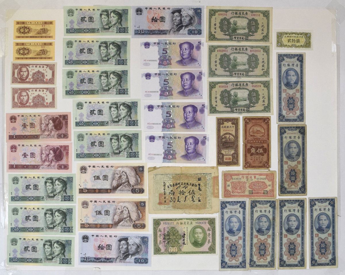 China & Taiwan, 1931-99. Lot of 39 Issued Banknotes, Includes: Kiangsu Farmers Bank, 1936, 50 Cents, P-S1198 S/M#C115-12, TTBC; Hainan Bank, 1949, 2 Cents, P-S1452 (2) S/M#H3-2; Ho Pei Metropolitan Bank, 1938, 6 Coppers, P-S1710K S/M#H63-31, PYPO; Kwangtung Provincial Bank, 1931, P-S2423 S/M#K56-14, ABNC; ND (1936) 5 Dollars, P-S2443 (3), S/M#K56-51, CHB; Bank of Dung Bai, 1945, 5 Yuan, P-S3727a S/M#T213-3; Bank of Taiwan, 1954, 10 Yuan, P-1967 (6) S/M#T7-32, PFBT; Peoples Republic of China, 1953, 1 Fen, P-860c (2); 1990-96, 1 Yuan, P-884b & P-884c; 1980 & 1990, 2 Yuan, P-885a (2) and P-885b (6); 1980, 5 Yuan, P-886a (2); 1980, 10 Yuan, P-887a (2); 1999 (2002), 5 Yuan, P-897 (4); 1999 (2001), 50 Yuan, P-900; 1999, 100 Yuan, P-901. Lot also includes note from North Korea Central Bank and additional Chinese note. Notes range from Good to Gem UNC condition. (30). Sold "AS IS" no returns accepted.
