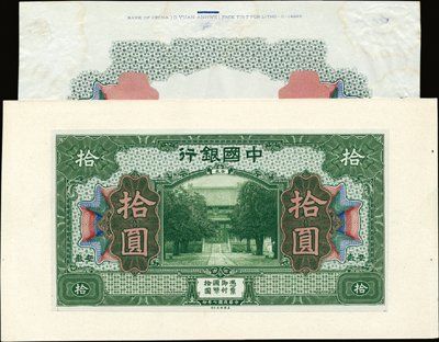 1918. P-53b unlisted; P-53h Unlisted. $10 2 different proof banknotes. P-53b, Anhwei; P-53h, Kalgan. Both are printed on india paper on large card and both have matching proof undertints that are printed on india paper only. Both notes are scarce and also unlisted as proof. No proof backs were found. Choice Unc. for proof faces, undertints are in mixed condition. ABNC.