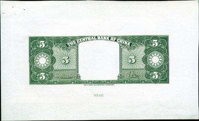 1945 (ca.1948). P-389 Unlisted. 5 Yuan Large Die Trial Color essay proof of back of banknote in green. Note was issued in blue. The issued banknote had a junk in the middle of the back for the vignette, this note has a blank space with no vignette. Choice Unc. Rare essay. SBNC.