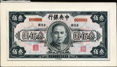 1944. P-unlisted. "?" Yuan. Essay face model or mockup in black on light blue and pink undertint of proposed Central Bank of China banknote by ABNC. Engraved border, vignette and design elements with undertint and hand drawn in pencil interior designs. Choice condition. Unique in archive. ABNC.