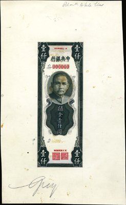 ca.1947-48. P-unlisted. 1000 CGU's. Essay face model or mockup in black with no undertint of proposed Central Bank of China banknote by either ABNC or SBNC. Engraved border, vignette and design elements with undertint and hand drawn in pencil interior flourishes and designs. Choice condition with light glue stains where possibly a couple small pieces of design elements pasted onto card were either removed or fell off. Unique in archive. ABNC.