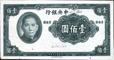 1941. P-243 Unlisted. 100 Yuan. 2 different banknotes. 1). P-243 Specimen with smal red specimen overprints and POC's; 2). P-243 Unlisted. It is the same as the previous note but is missing the light multicolor undertint from the face. Archival notations on face "6/26/44". Rare variety that is unlisted in SCWPM Both are uncirculated. SBNC