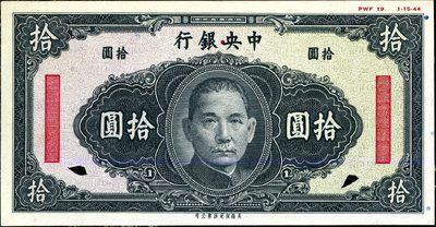 1944. P-unlisted. 10 Yuan. Uniface front proof of essay Central Bank of China note by Security BNC. Obverse has red "PWF 19 1-15-44" on the upper right. Cut out cancels. Mounting remnants on reverse. Unc. condition. Black border with light green undertint and 2 red vertical bars to the left and right of the vignette. Printed on bank note paper. Each proof has an 8 character Chinese printer name (Security Bank Note Company) on the bottom in small letters. Extremely rare note. SBNC