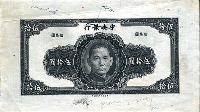 1944. P-unlisted. 50 Yuan Uniface front proof of essay Central Bank of China note by Security BNC. Printed on bank note paper with large margins. Bottom has 8 character Chinese printer name (Security Bank Note Company) on the bottom in small letters. Notations in margins and title crossed out. dated 6-21-44. AU condition. Extremely rare note. SBNC.