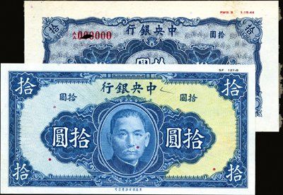 1944. P-unlisted. 10 Yuan Uniface front and back proofs of essay Central Bank of China note by Security BNC. Obverse has black "SF 127-B" on the upper right. Reverse has red "PWB 3 1-15-44" on the upper right and red "000000" serial numbers with cut out cancels. Mounting remnants on reverse back. Both are in AU-Unc. condition. One front is blue with light yellow and boue undertint, the back dark blue. Printed on bank note paper. Each proof has an 8 character Chinese printer name (Security Bank Note Company) on the bottom in small letters. Extremely rare note. SBNC.