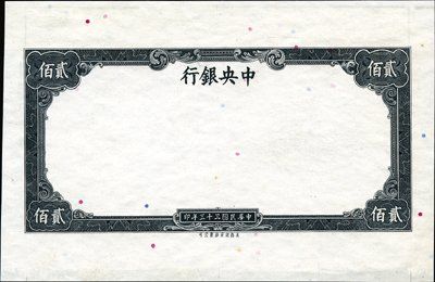 1944. P-unlisted. 200 Yuan Uniface front and back proofs of essay Central Bank of China note by Security BNC. Printed on bank note paper. Front proof has frame only with bank title and denomination, no vignette or text. Each proof has an 8 character Chinese printer name (Security Bank Note Company) on the bottom in small letters. AU-Unc. condition. Extremely rare if not unique note. SBNC.