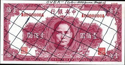 1945. P-unlisted. 100 Yuan Specimen of essay Central Bank of China note by Security BNC. The front is a plum color and the back is a light brown color. Obverse has red "100 F8 2-12-45" on the upper right and red "00000" serial numbers. Top margin has handwritten in ink "OVER - (color 1000 Yuan Face)". Face is also cross hatched in black ink. Reverse has red "BC 7A 2-12-45" on the upper right. Top margin of back has handwritten in ink "This color on face of 100 Yuan". Note is in AU-Unc. condition. Note has an 8 character Chinese printer name (Security Bank Note Company) on the bottom in small letters. Extremely rare note and unique in archive. SBNC.