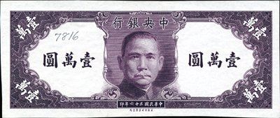 1948. P-363 TC Essay. 10,000 CGU Trial Color essay specimen of proposed design for P-363. Purple front and back. Issued color of note with different design was blue. Obverse has red "P 5-8-48 10M CGU BN 17850-F" on the upper right and red "00000" serial numbers. Back has red "P 5-8-48 10M CGU BN 17850-B" on the upper right and red specimen overprints. VF condition with considerbale archival notations for changes and corrections of design. SBNC.