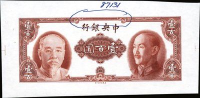 1945 (1948). P-393 TC; P-394 TC. 5 Yuan 2 different trial colors proofs. 1) P-393 TC proof back printed on india paper in brown. Note was issued in black. 2) P-394 TC proof front printed on india in brown. Issued note was printed in red. Unique pair in archive. Unc. condition. ABNC.