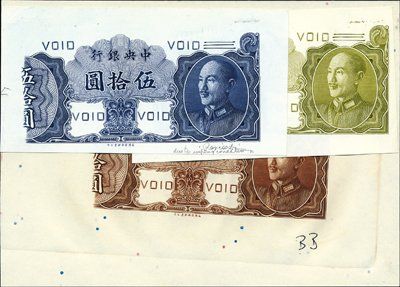 1948. P-405 TC. 50 Yuan 3 different Trial Color front proofs printed on banknote paper. Colors of notes are brown, blue and olive green. Issued color of note was red. Left side of plate is not fully engraved. All 3 notes appear Unc. Rare. SBNC.