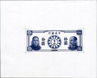1954. P-Unlisted Essay. 10 freedom Yuan Unique Production file for proposed 1954 "Freedom Yuan", Central Bank of China, banknote essay series by SBNC that was never issued. Evidently the "Cultural Revolution" got in the way of this issue coming into existance. This group includes proofs, specimens, models and original artwork and sketches for the proposed designs. Incuded are partially completed design proofs for face and back of 10 Freedom Yuan banknote. Face has SYS on left and CKS on right. Central star vignette has Chinese lettering for "Freedom". Written in small letters on upper right is "10F-BN-26037" and on upper left is date "6-11-54". Back has "Central Bank of China" and "10 Freedom Yuan" on right. Both printed in black. A uniface specimen of P-283 is also included. Also included are undertint proofs; corner proofs; original artwork for central face vignette; proof of border and outline of face proof; pencil sketches of Chinese text and numerals and design elements; a pencil sketch of the map of China; original hand drawn in ink of the central Chinese characters for "Freedom" as well as the banknote title. Original file folder included that has undertint proof of "Freedom" note as well as additional production correspondence. Unlisted in Pick. Unique oppurtunity to own an unknown proposed essay production file. Deserves further research. Choice condition overall. (26 pieces). SBNC.