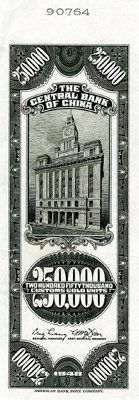 1948. P-Unlisted (3). 250,000 CGU Uniface LDP of back of Essay note that was never produced. This is a trial color proof in black. Printed on india paper. Note has tear in middle of the left margi that just touches note on left middle margin. Rare. ABNC.