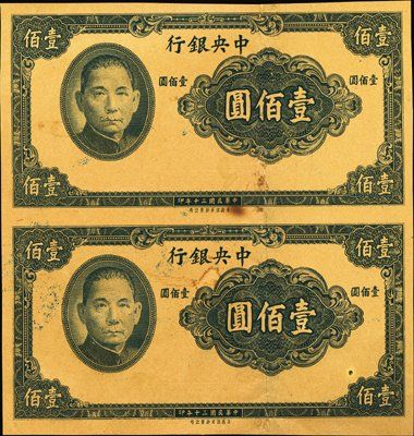 1941. P-243 Unlisted. 100 Yuan Vertical uncut pair of trial color specimen - proofs, printed on light brown soft paper with grey-black face and blue back. Issued note had purple back. Fine condition with toning spots in middle of notes and one vertical fold toward the right side from archival storage. Rare note. SBNC.