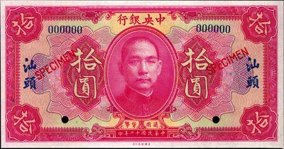 1923. P-176Af. $10. Specimen banknotes. Dark pink face and orange back. Chinese characters on face to the left and right of SYS in blue for "Swatow", back has blue "Swatow" on left and right. Red specimen overprints, POC's and "000000" serial numbers. Choice uncirculated condition with large even margins. Rare notes only known as specimen. This note and almost all of the Central Bank of China specimen banknotes for "1923 Issue" have not had their prices changed since 1990 when I cataloged and priced them for this catalog. All are extremely rare. ABNC