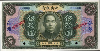 1923. P-178Ac. $50. Specimen banknotes. Olive green face and grey-black back. Chinese characters on face to the left and right of SYS in blue for "Swatow", back has blue "Swatow" on left and right. Red specimen overprints, POC's and "000000" serial numbers. Choice uncirculated condition with large even margins. Rare notes only known as specimen. This note and almost all of the Central Bank of China specimen banknotes for "1923 Issue" have not had their prices changed since 1990 when I cataloged and priced them for this catalog. All are extremely rare. ABNC