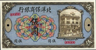 1919. P-S2516A Unlisted Trial Color. 5 Yuan. Specimen trial color banknote. Choice Unc. Unlisted color brown instead of issued color violet on face and brown instead of vilolet back. Red specimen overprint, POC's and "000000" serial numbers. Rare banknote. ABNC